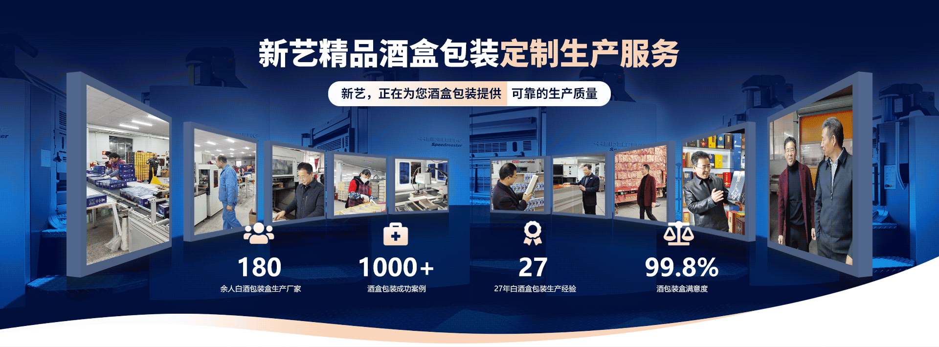 新艺白酒包装盒厂家凭借卓越的生产实力和专业服务,成功成为茅台集团、双沟股份、杜康控股、沙城老窖等国内1000+酒厂及经销商的重要合作伙伴。酒厂之所以选择我们,源于我们对酒盒包装的独特理解和专业技术。 信赖新艺,是因为我们不仅仅提供标准化的酒盒生产服务,更能灵活应对客户个性化的需求。我们秉承精细制作的工匠精神,为每个酒厂量身打造符合其品牌特色的精品酒盒包装,助力其在市场中脱颖而出。